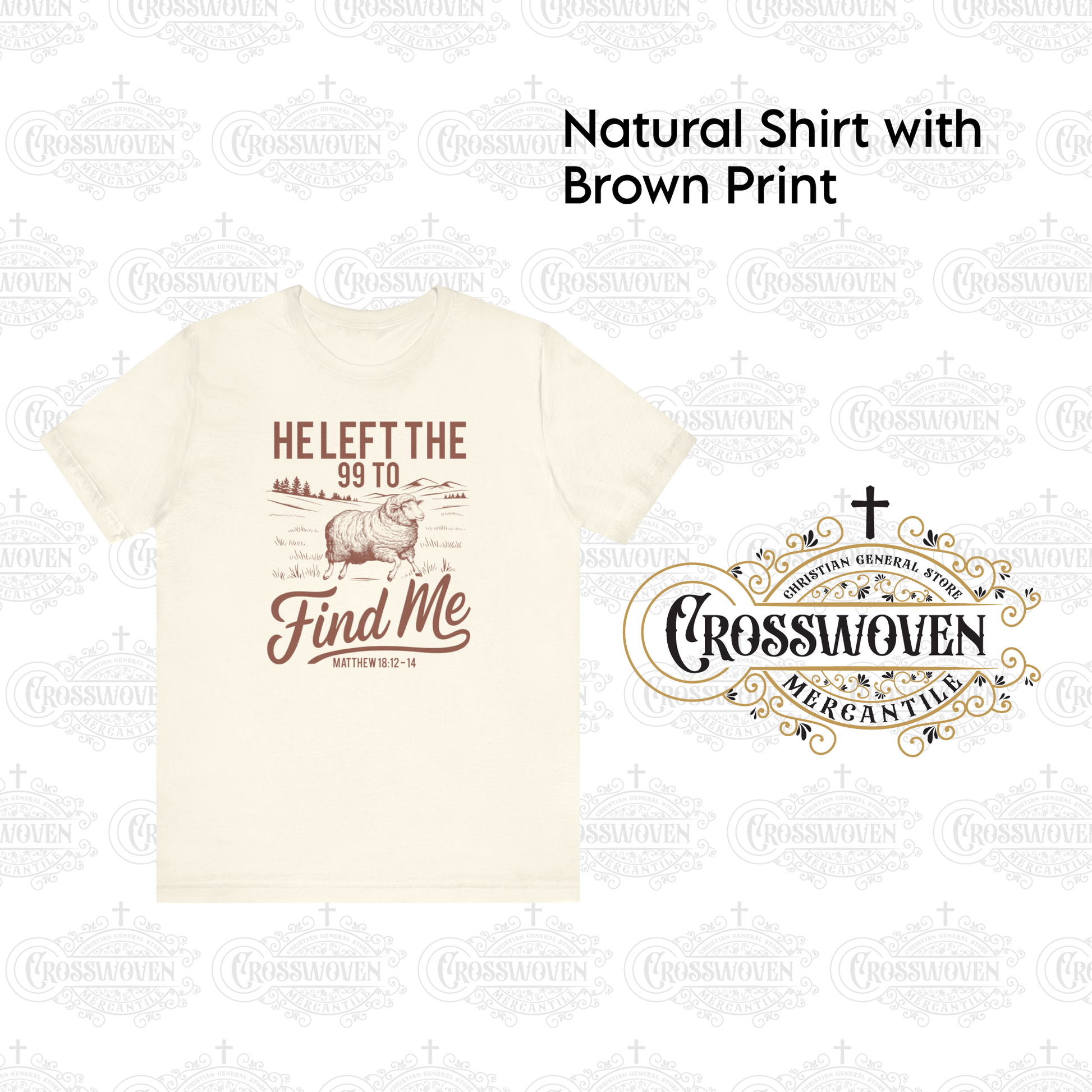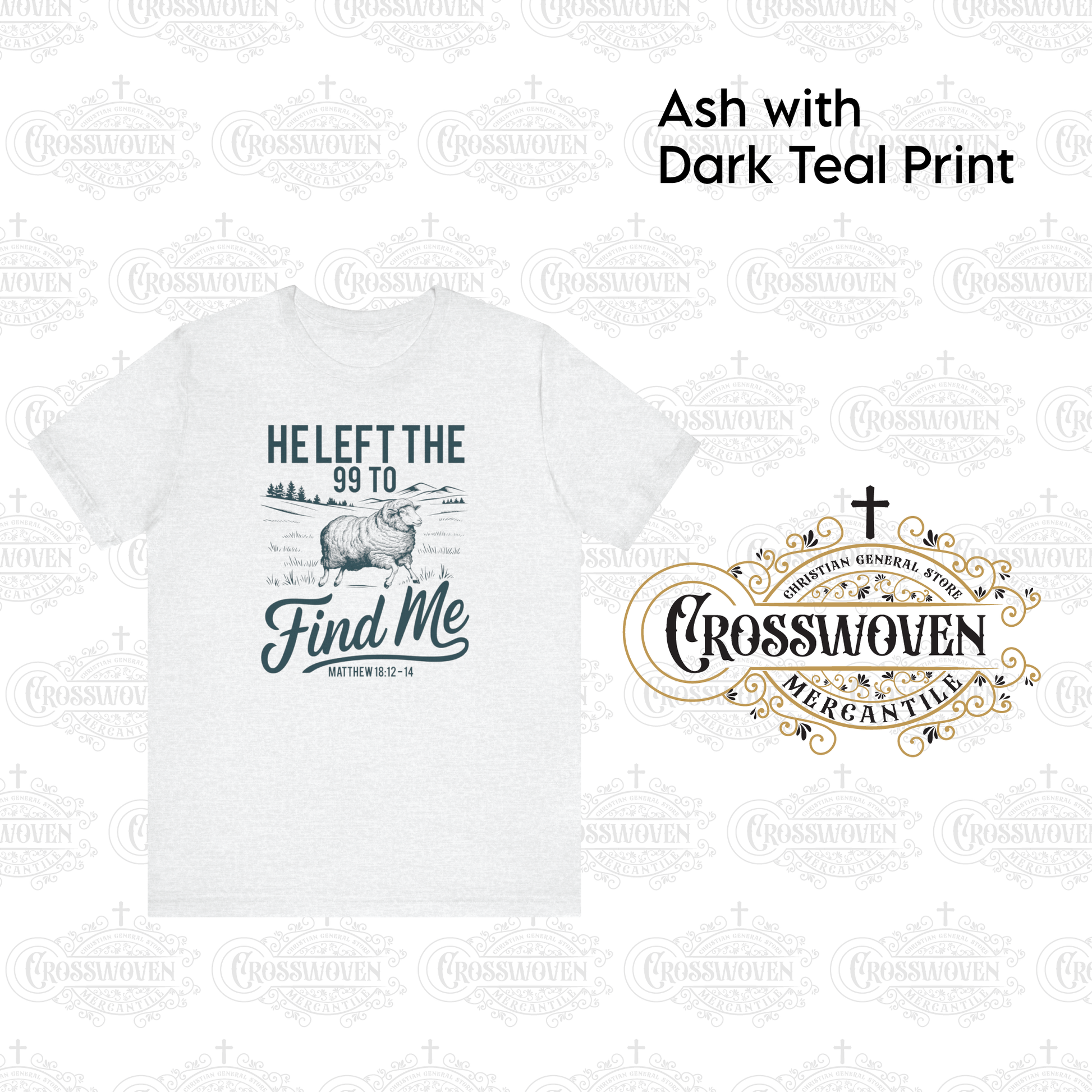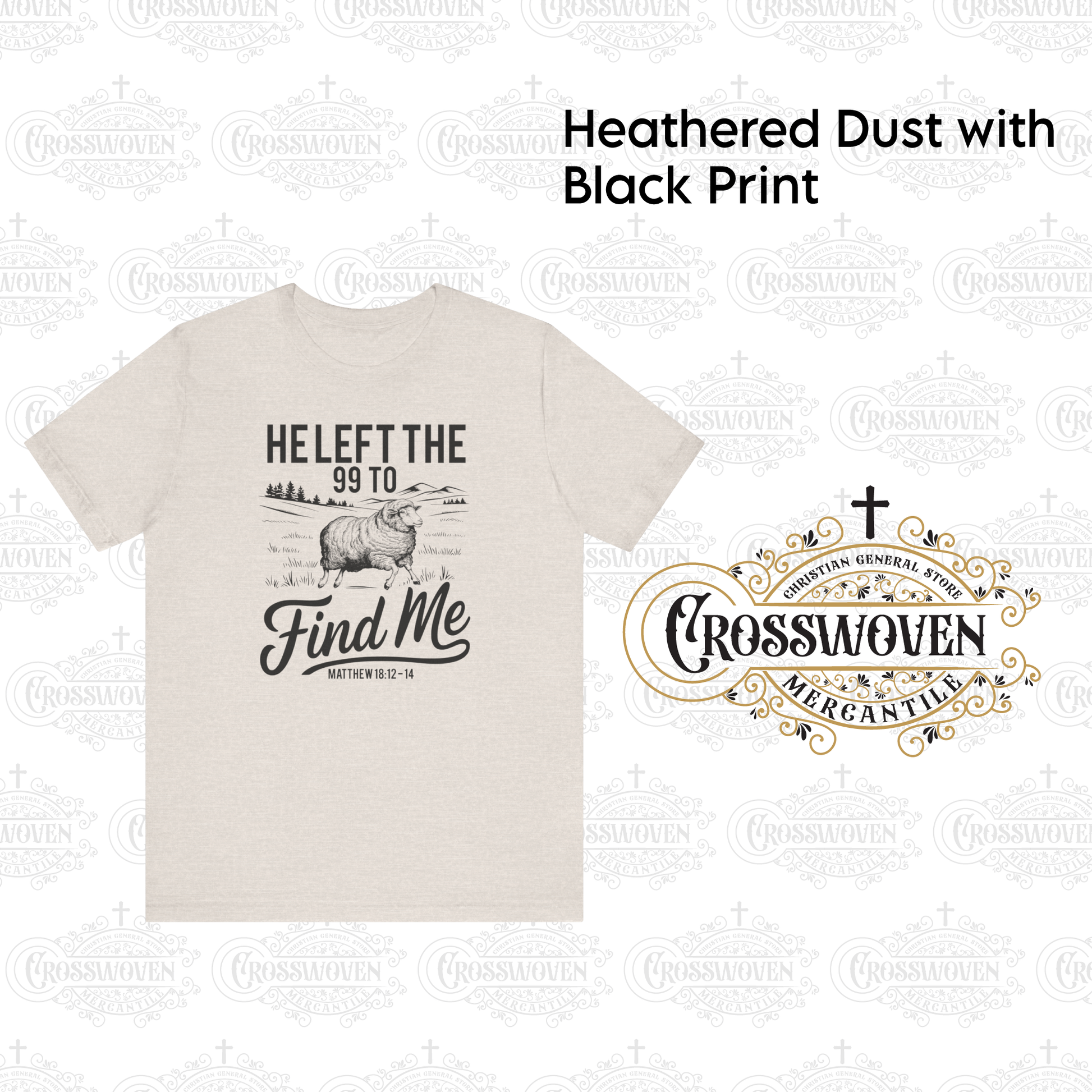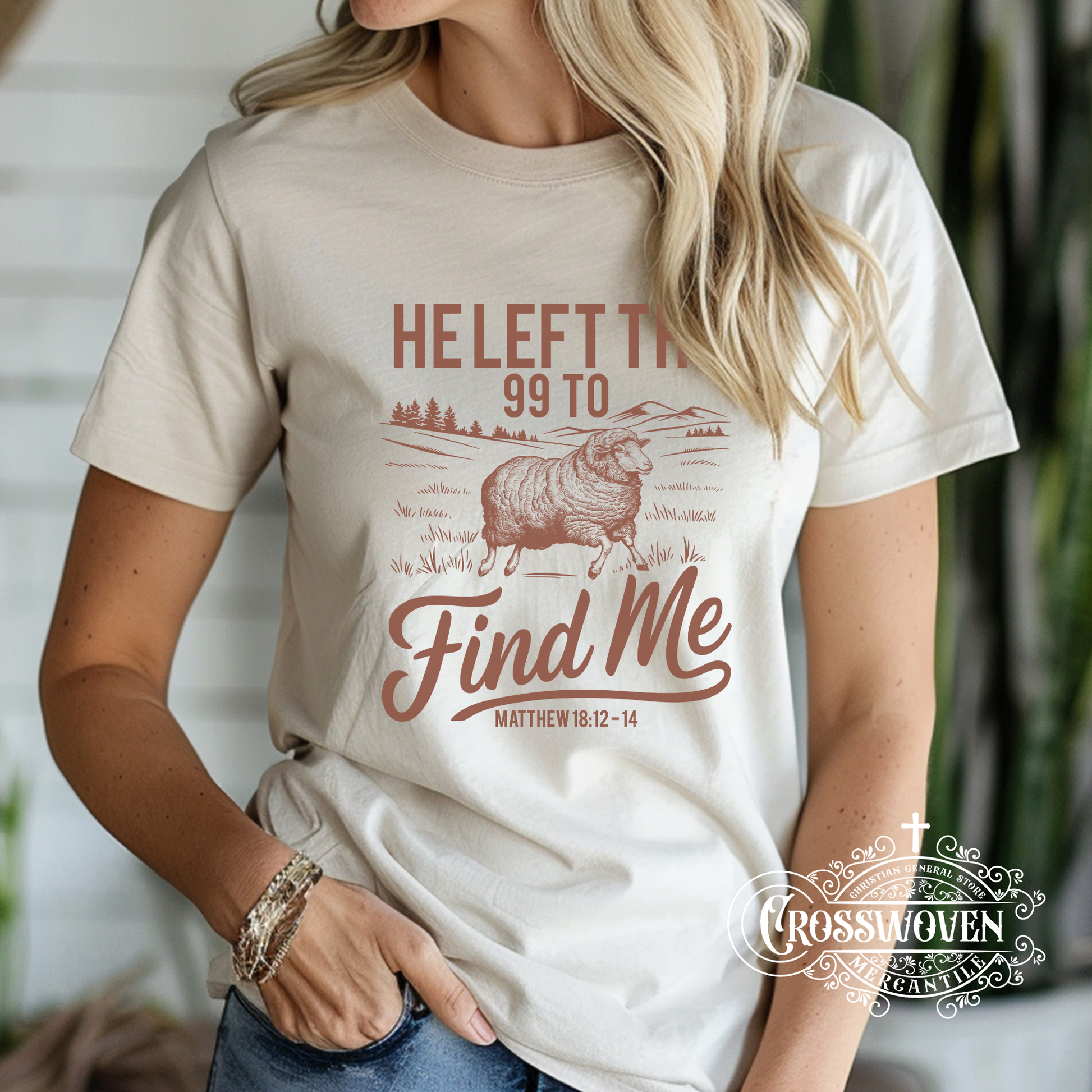 Durable Printed Design: A vintage-style illustration of a lone sheep against a pastoral backdrop, accompanied by the phrase “He Left the 99 to Find Me” and “Matthew 18:12–14.” High-quality, water-based ink ensures a crisp, long-lasting print that won’t fade or crack.